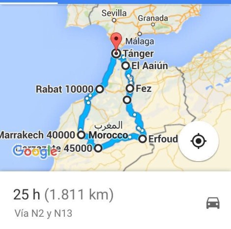Hoy comienza mi viaje en moto a Marruecos. La idea es simple: coger un ferry desde Algeciras que me llevará directo a Tánger. Desde allí viajaría al Sahara pasando por ciudades como Chefchaouen y Fes. Una vez en las arenas de Merzouga, cruzaría la coordillera del Atlas por las gargantas del Dades y del Todra, para pasar por la ruta de las Kasbash, hasta Marrakech. Una vez allí empezaría mi viaje de vuelta por Casablanca, y Rabat, de nuevo hasta Madrid.