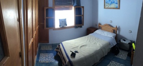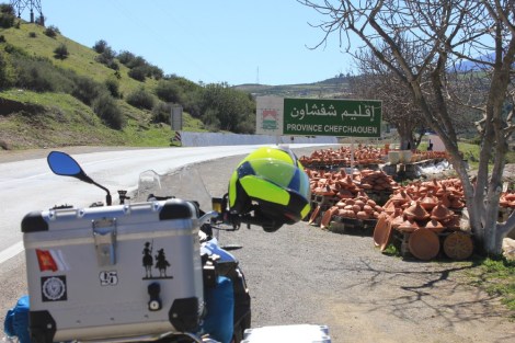 Al fin, entre las montañas veo Chefchaouen: “la que mira los cuernos de la montaña.” Al llegar, como unos huevos fritos con un embutido muy raro que sabe a mortadela, y me pongo a buscar un hotel. Tras ver varios, encuentro uno en que pueden guardarme la moto en el patio trasero: el Al Kazaa. Por 150 MAD (13euros) dormimos la moto y yo, a las puertas de la medina.