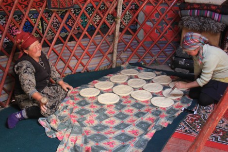 Cuando volví al yurt con los niños me encontré a la familia amasando pan. Le daban forma con las manos y usan unos instrumentos con pinchos para hacerle agujeros con forma de flor.