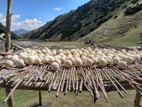 Salimos afuera y me dieron a probar el kurut, unas bolas de queso hechas con leche de vaca que saben especialmente fuerte. Ya lo había probado antes pero me lo comí como si fuera la primera vez que lo probaba.